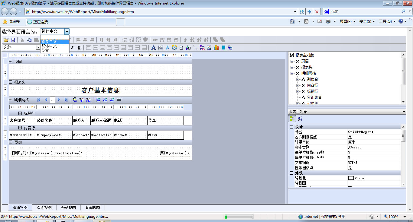 | 设定控件界面语言 | 切换控件的界面语言,并实时更新显示。在本页的上端也可以设定界面语言,这样的方式实现在报表首页设定界面语言。 | ||