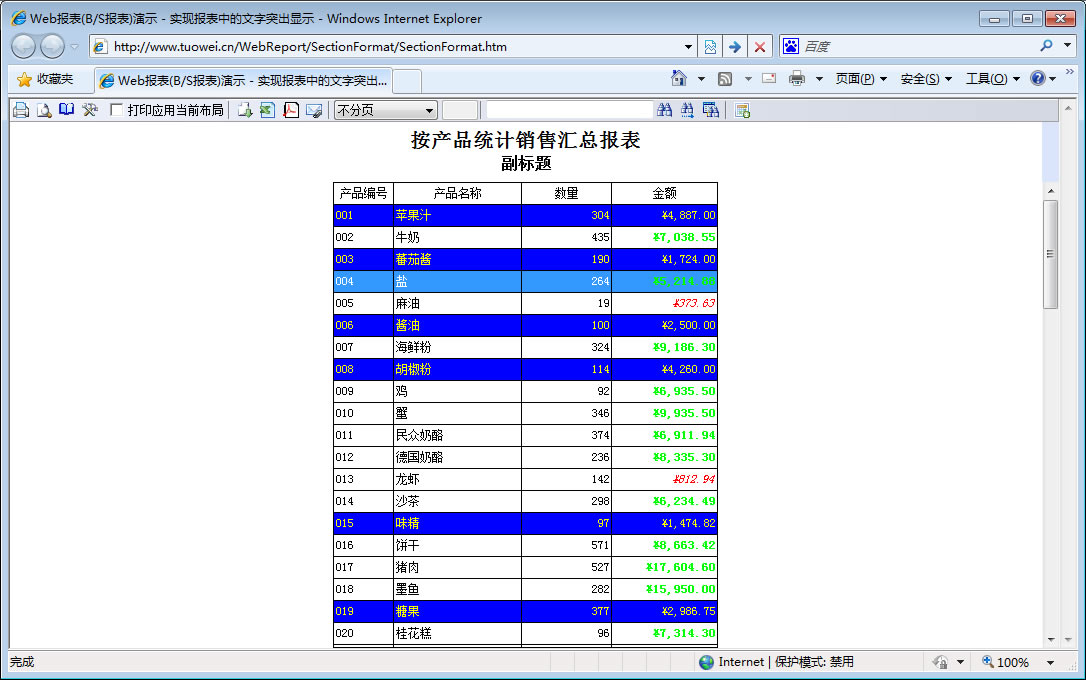 | 文字突出显示 | 在报表的SectionFormat事件中按条件改变显示外观属性,实现文字突出显示。 | ||