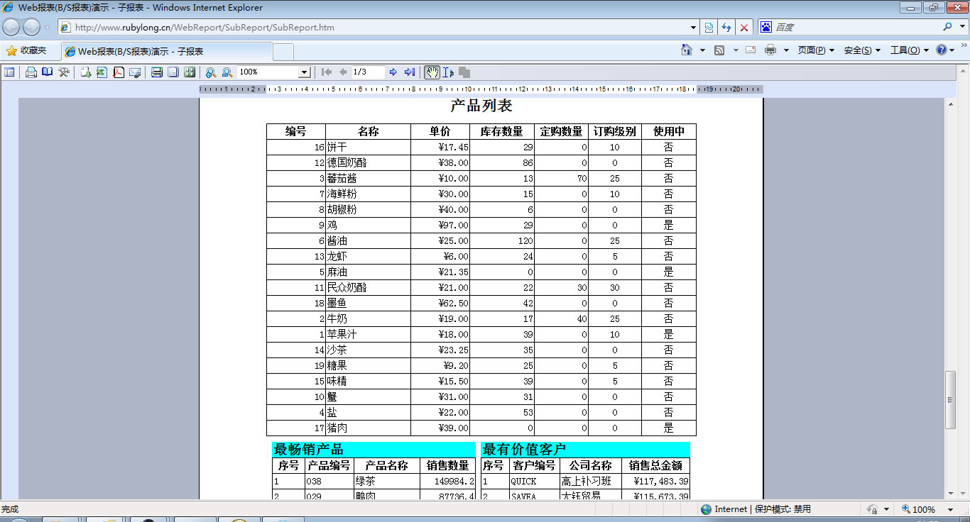 | 1g.演示子报表 | [设计] | 演示子报表,在一个主控报表中显示多个子报表,实现多个报表的集中展现。 | |