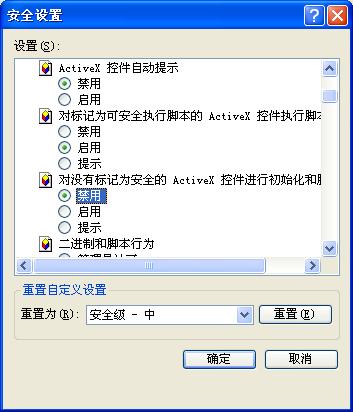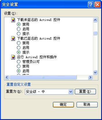 - 打开 IE 浏览器-〉工具-〉Internet(或本地Intranet)选项-〉安全-〉自定义级别,找到窗口中的“ActiveX