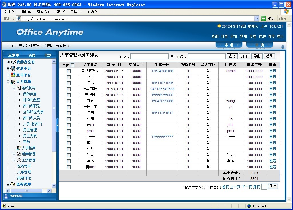 以列表的形式显示系统内所有的未离职的员工信息。点击手机号码可以给该员工发送短信,点击查看可以查看该员工的详细信息。