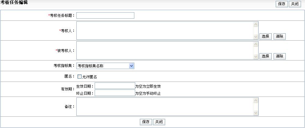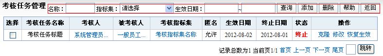 考核任务的建立考核指标集及具体的考核项目设定后,即可进行考核任务的新建,具体方法为:单击“人力资源-绩效考核-考核任务管理-新建考核任务”打开新建考核任务页面,输入相应的信息,点“发布”即可。 说明: 1、管理范围在系统管理-用户管理中设定。 2、新建考核任务时若不勾选“按照管理范围”,则所有的考核人可以对所有的被考核人进行考核,被考核人的最后各项得分及考核总成绩均取为平均值。