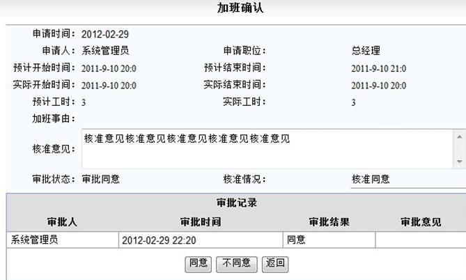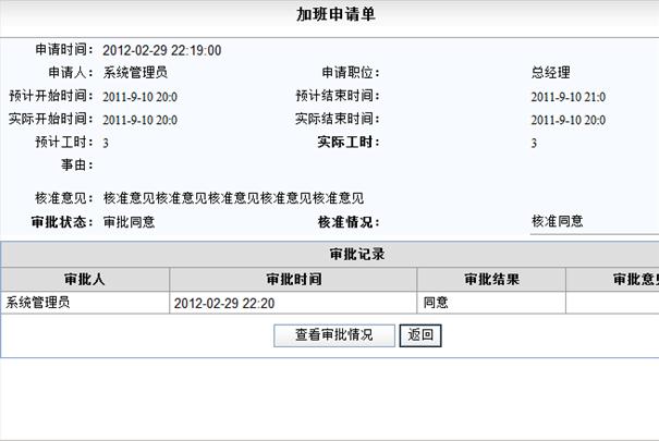 查询加班申请单信息 加班核准人可查看加班申请单信息。点击上个界面中的某条记录前的[详细],可查看该条加班申请单的信息。如下图: