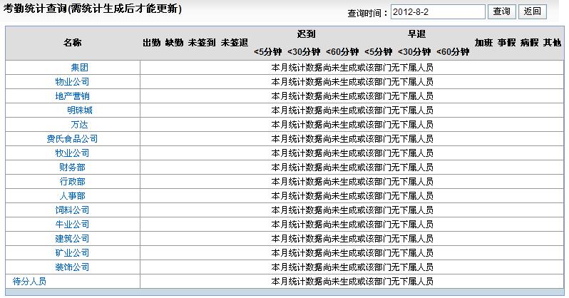 授授权用户可以查看公司内各部门人员的某段时间的上班状况,便于公司的管理;输入查询的条件,单击查询即可。