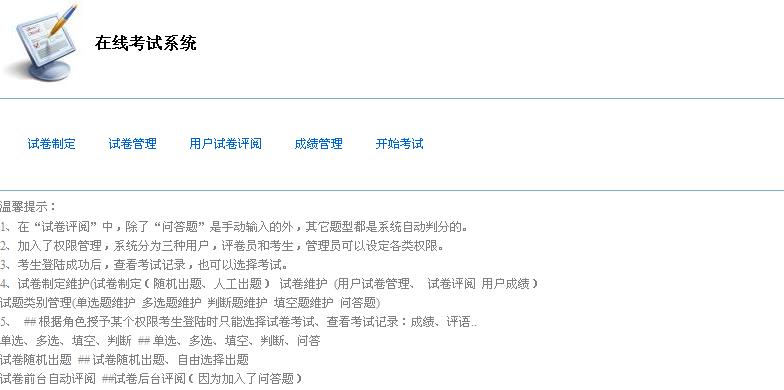 在线考试中,一共有试卷制定、试卷管理、用户试卷评阅、成绩管理和开始考试五个模块组成。