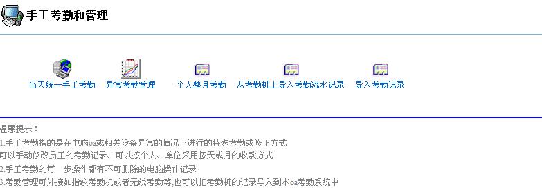 考勤管理可外接如指纹考勤机或者无线考勤等,也可以把考勤机的记录导入到本oa考勤系统中。