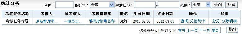 考核数据的查询考核结束后,在人力资源-绩效考核-考核任务管理中进行考核数据的查询,并进行分值统计、分数导出等。 说明: 1、点击“查阅”,弹出考核数据查询窗口,单击“具体的条目查看详细的打分情况” 2、单击“分值统计”,在弹出窗口中输入要统计的分数段(例如输入(100,90,89,80,79,70,69,60,59),则统计的分数段即为(100-90,89-80,79-70,69-60,59-0)),点击“确定”则以图表形式显示出统计结果。