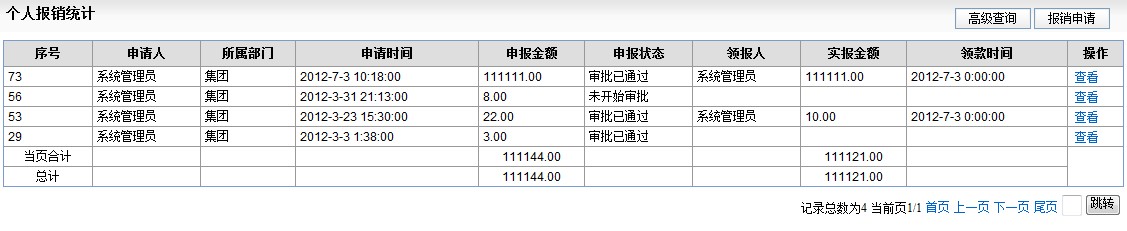 此页面显示当前操作员所有报销情况。 可按指定的条件查询个人报销信息。 点击某一单据的[+]可展开显示报销事由。 点击某一单据的[明细]可显示该笔报销单据的详细信息,包括:报销明细、审批情况、报销登记情况等。