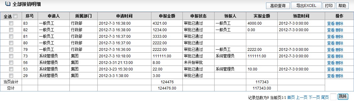 此页面显示所有员工的所有报销情况。 可按指定的条件查询报销信息。 点击某一单据的[+]可展开显示报销事由。 点击某一单据的[明细]可显示该笔报销单据的详细信息,包括:报销明细、审批情况、报销登记情况等。