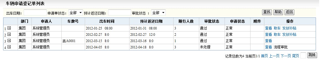 单击“新建”,填写车辆申请登记单; 单击“删除”,删除车辆申请登记单; 提示: 只能删除自己的申请单。 单击“返还”,归还车辆; 提示: 只能归还自己已审批通过的车辆。 单击“撤销”,撤销车辆申请单; 提示: 只能撤销自己的申请单。 输入查询条件,单击“查找”,可查看申请车辆的情况。