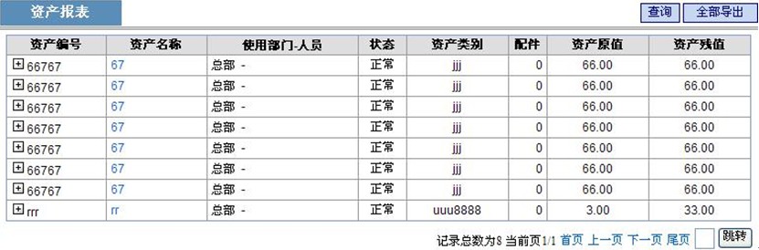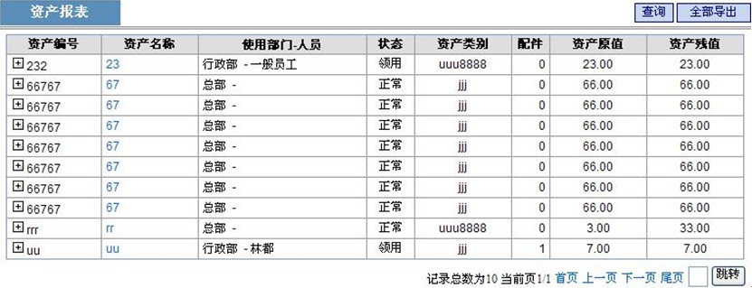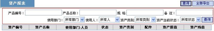 本模块具有权限限制,由部门经理或主管控制。是对本部门员工使用固定资产情况的查询。 点击"全部资产"按钮进入全部资产界面