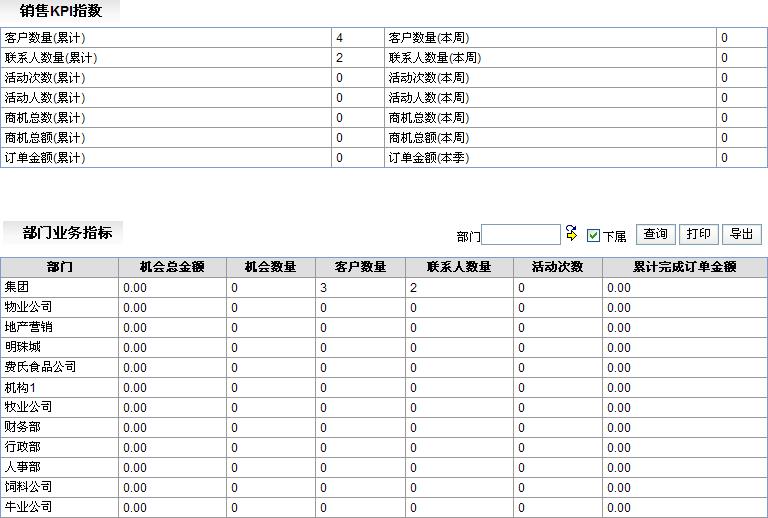 客户 联系人 计划 活动 项目 订单 汇总 个人业务指标 部门业务指标 商品管理 销售KPI指数 销售指数 销售机会