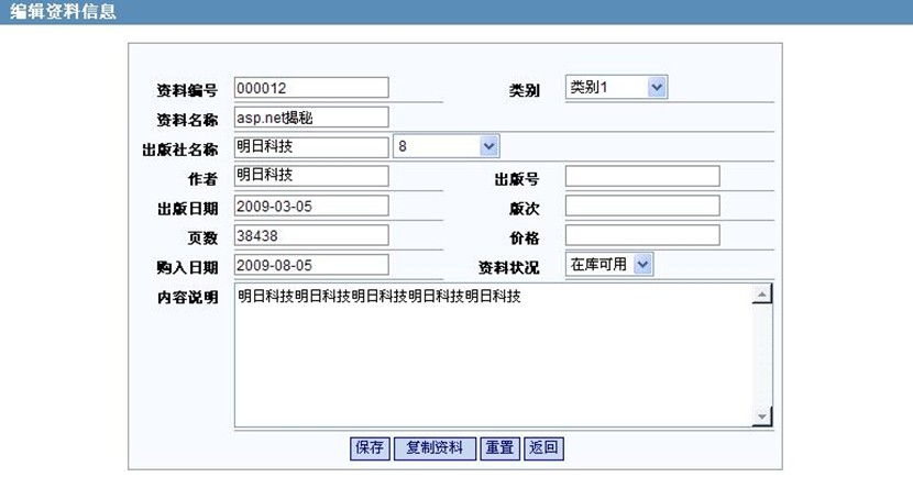 资料采购完成后,应及时由单位的指定人员进行资料信息入库登记。可查询、新增、删除资料。
