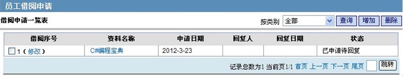用户可新增、删除资料借阅申请或按类别查询申请。