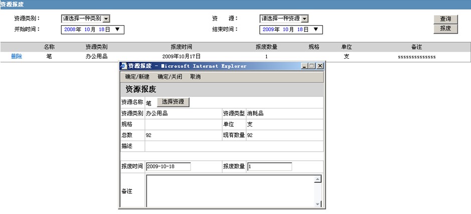 单击“报废”,弹出窗口,如上图所示。 单击“选择资源”选择要报废的资源,如下图所示。 填写报废信息,如下图所示。 单击“确定/新建”或“确定/关闭”保存数据。 提示: 输入查询条件,单击“查询”即可查看资源报废情况。