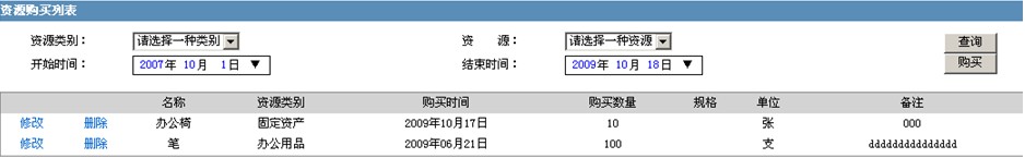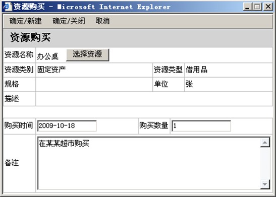 单击“选择资源”,弹出窗口,选择相关类别 选择要购买的资源,点确定即可 单击“确定”即可 输入购买数量和购买信息,如上图所示 单击“确定/新建”或“确定/关闭”保存数据。 提示: 输入查询条件,单击“查询”即可查看资源购买情况; 确定/新建: 即保存当前数据后再可新增一条新记录